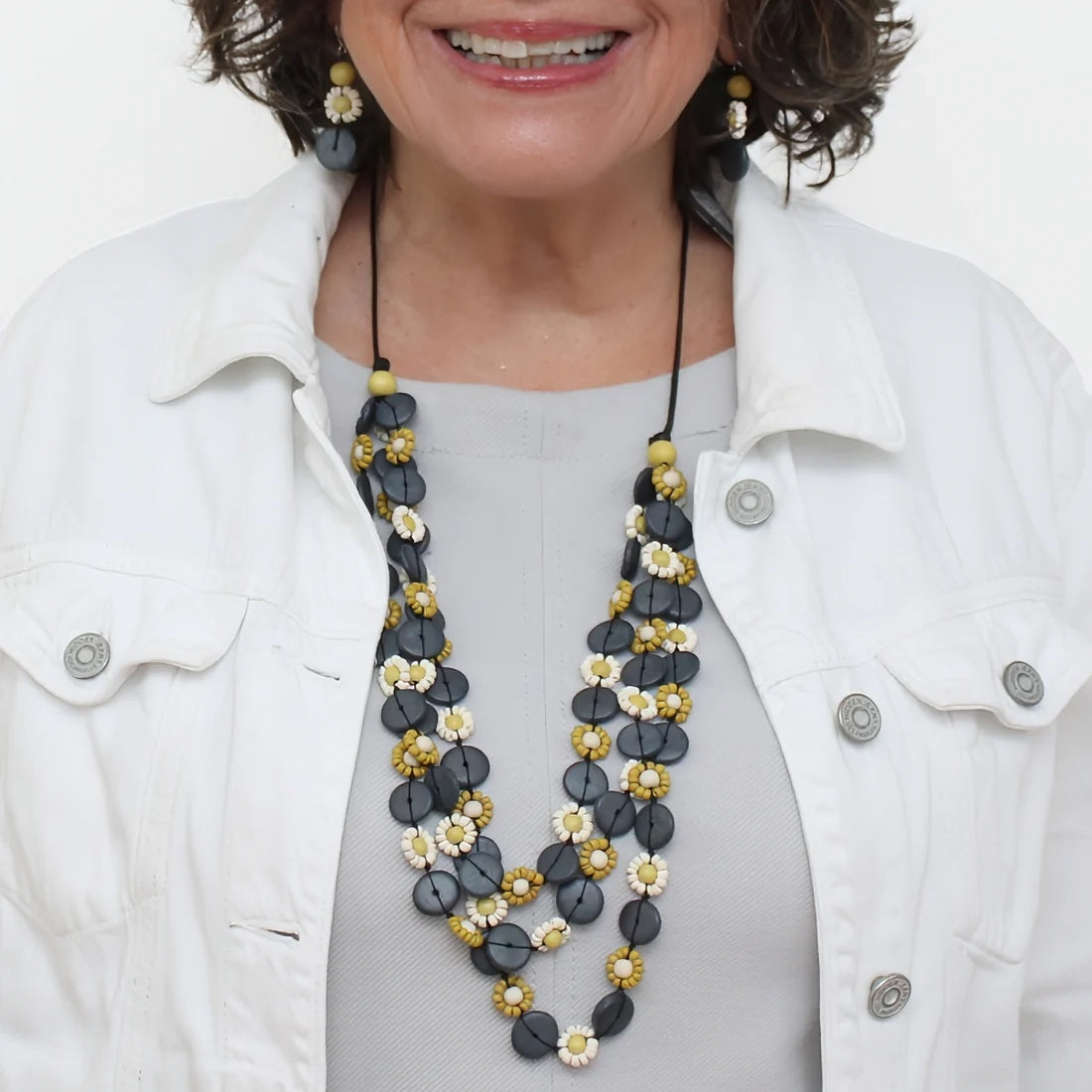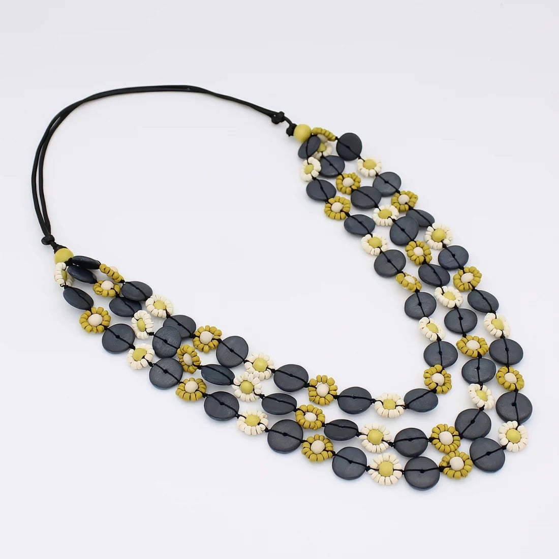 This playful triple strand necklace features hand-strung mini daisies in vibrant chartreuse, cream, and black. Lightweight and adjustable, it’s a boho statement piece that adds a cheerful, fresh vibe to any outfit.
