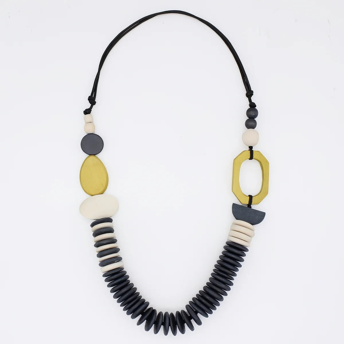 Make a striking impression with the Chartreuse Wood Sophie Necklace. Featuring bold circular chartreuse beads accented by uniquely shaped charcoal and cream wood beads, this handcrafted necklace boasts an intricate design that draws attention. Strung on a durable wax cord, it offers versatile, adjustable wear to complement any outfit effortlessly. Elevate your look with this captivating statement piece.