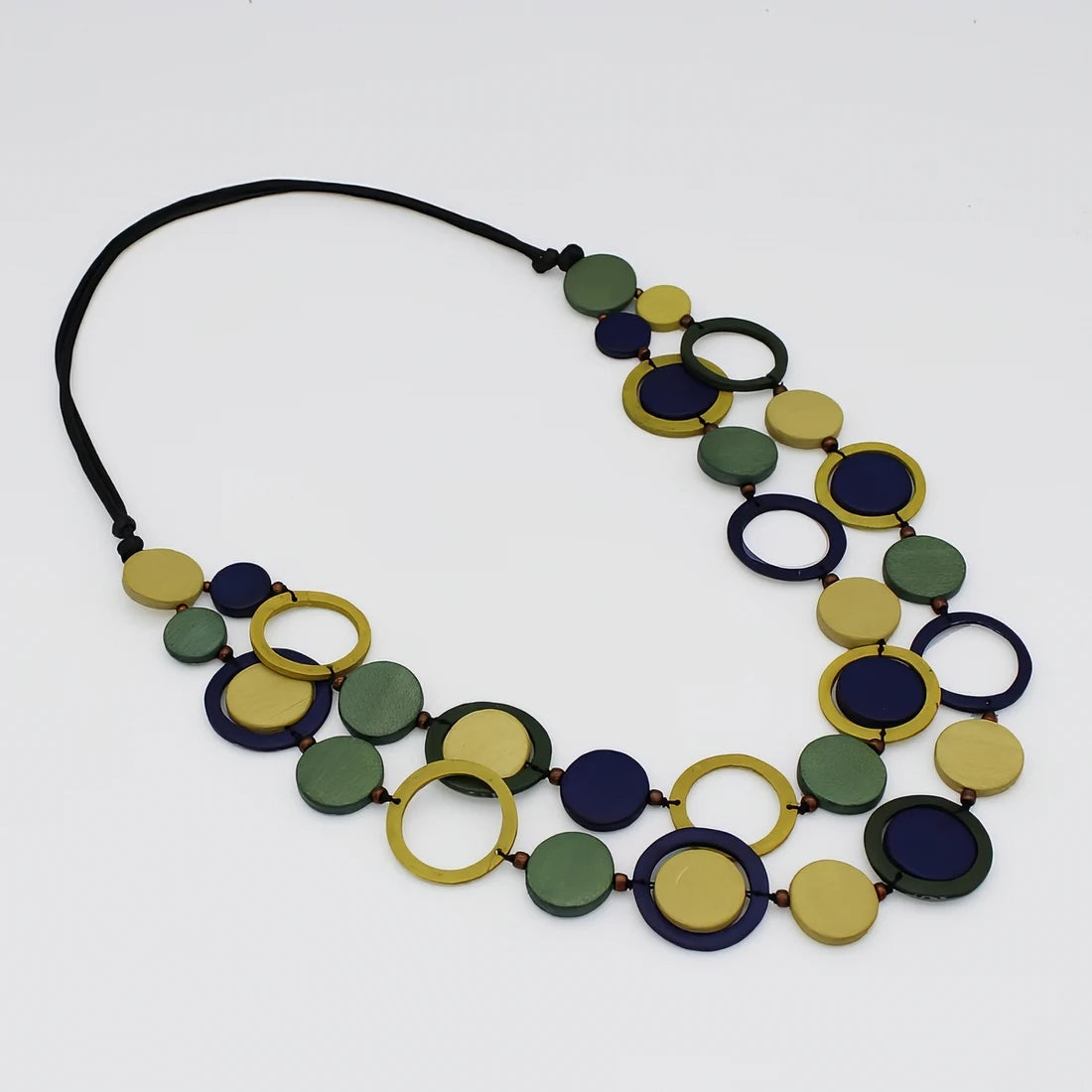 Add a splash of fun to your look with this double strand Yellow Circle Cut-Out Necklace featuring playful cut-out circles in navy, green, and yellow. Lightweight and comfortable, its multi-sized beads create a lively, eye-catching design perfect for brightening any outfit.