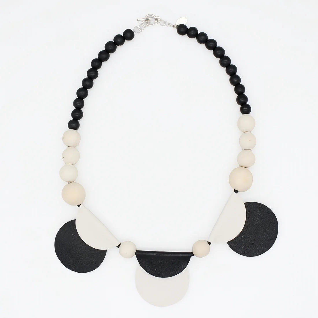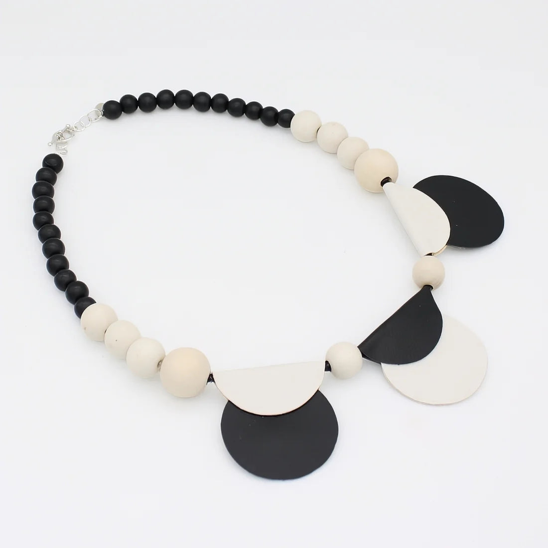 Bold yet refined, the White Rae Half Moon Leather Statement Necklace is designed to captivate. Featuring a half-moon silhouette in bright white and black leather, this piece pairs modern geometry with timeless elegance. Lightweight yet commanding, it’s the perfect accessory to elevate both casual looks and evening ensembles.