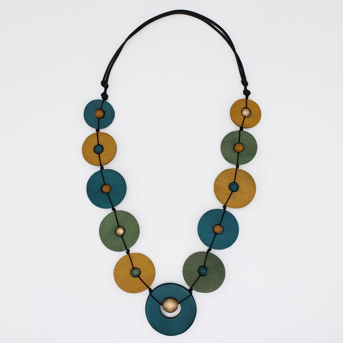 The Teal Wood Unity Necklace showcases a refined blend of teal, olive green, and mustard wooden circles, each featuring a delicate center bead. Hand-strung on an adjustable black wax cord, this lightweight single-strand necklace offers both comfort and elegance, making it a versatile accessory for a sophisticated look.