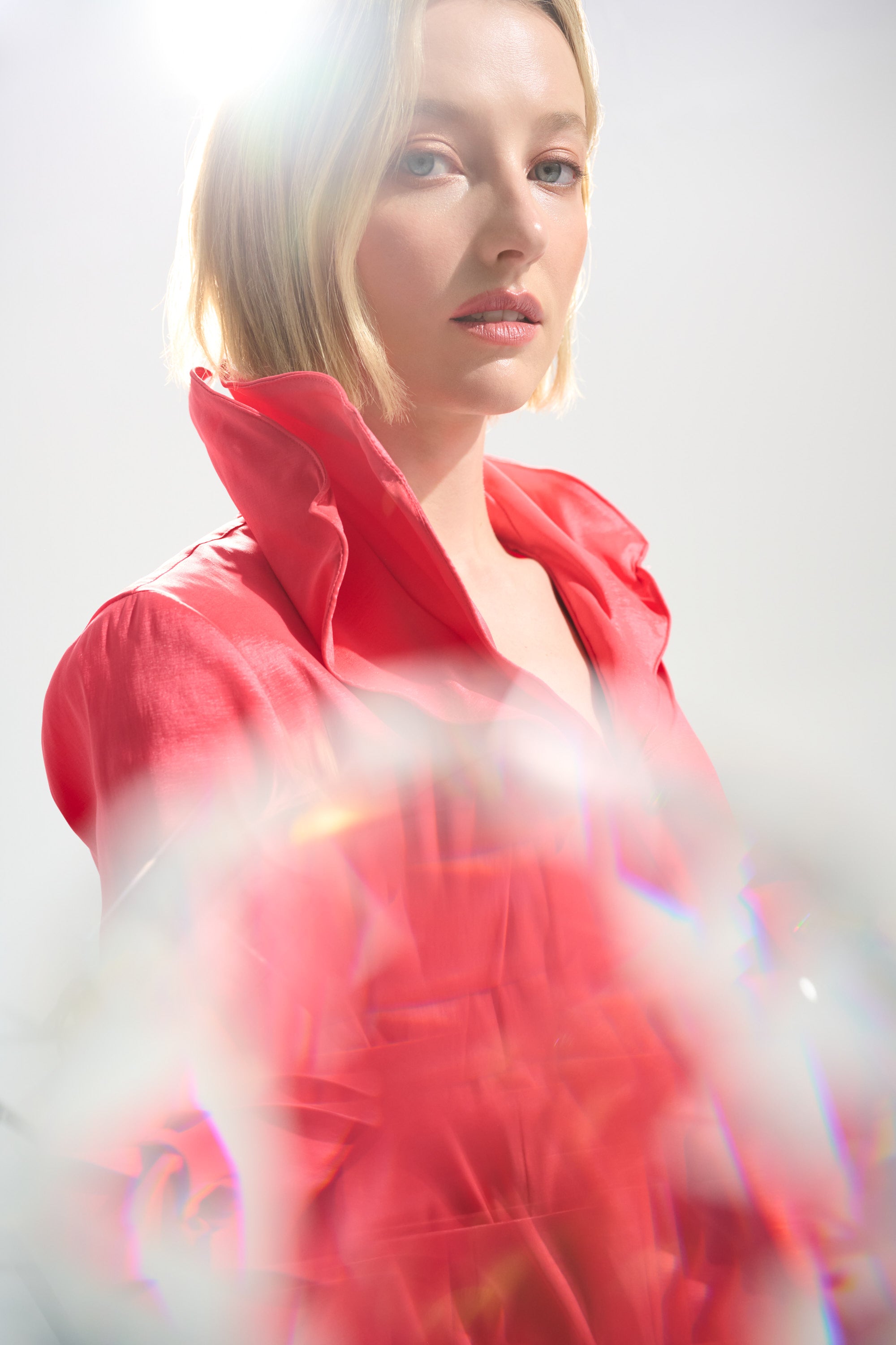 Sculpted yet fluid, this stretch taffeta dress features a wired double lapel collar, waist sash, and pleated skirt. The Rhinestones zipper pull adds a refined touch to its confident silhouette. Part of the Signature collection.