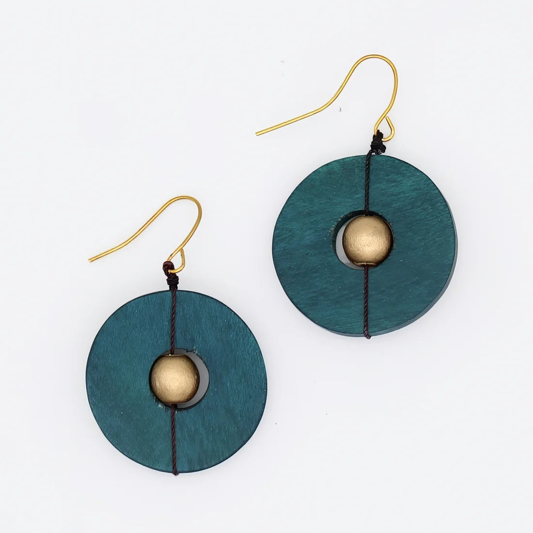 The Teal Unity Earrings combine a circular teal bead with a gold wood bead nestled inside, showcasing expert craftsmanship. These lightweight dangle earrings are designed for comfort and elegance, suspended from classic French wire hooks. Handcrafted to deliver a distinctive statement, they offer a refined accessory for those who appreciate meticulous detail and sophisticated style.