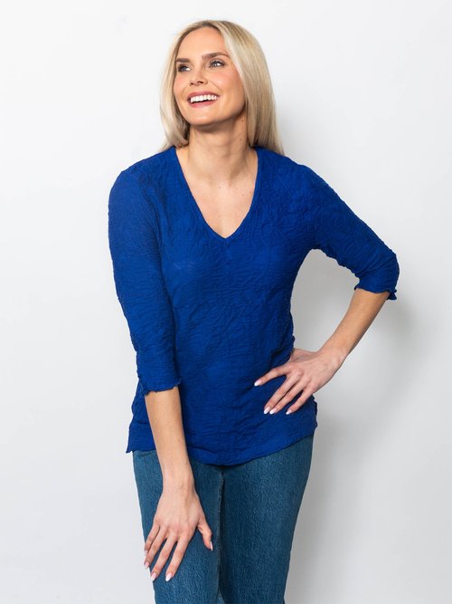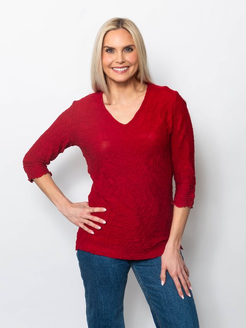 - V-Neck ruched sleeve top with elbow ruched sleeves and side slits.
