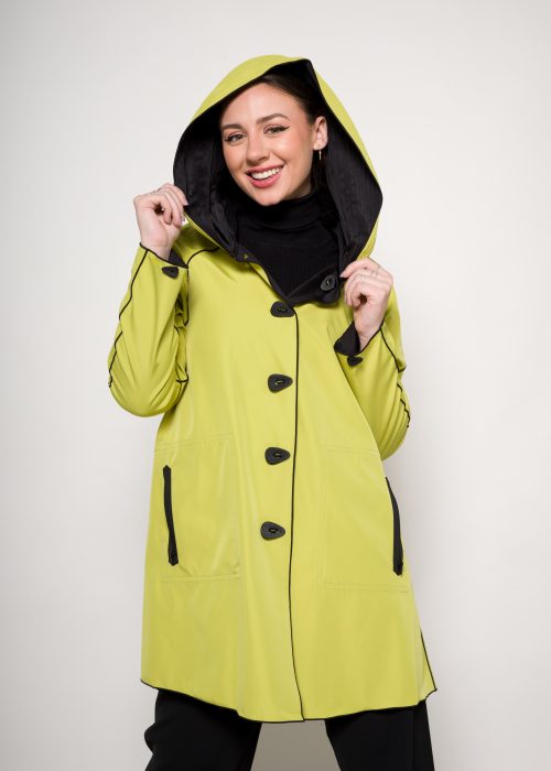 Our fully reversible button front Parisian features a pleated hood, and button cuffs.