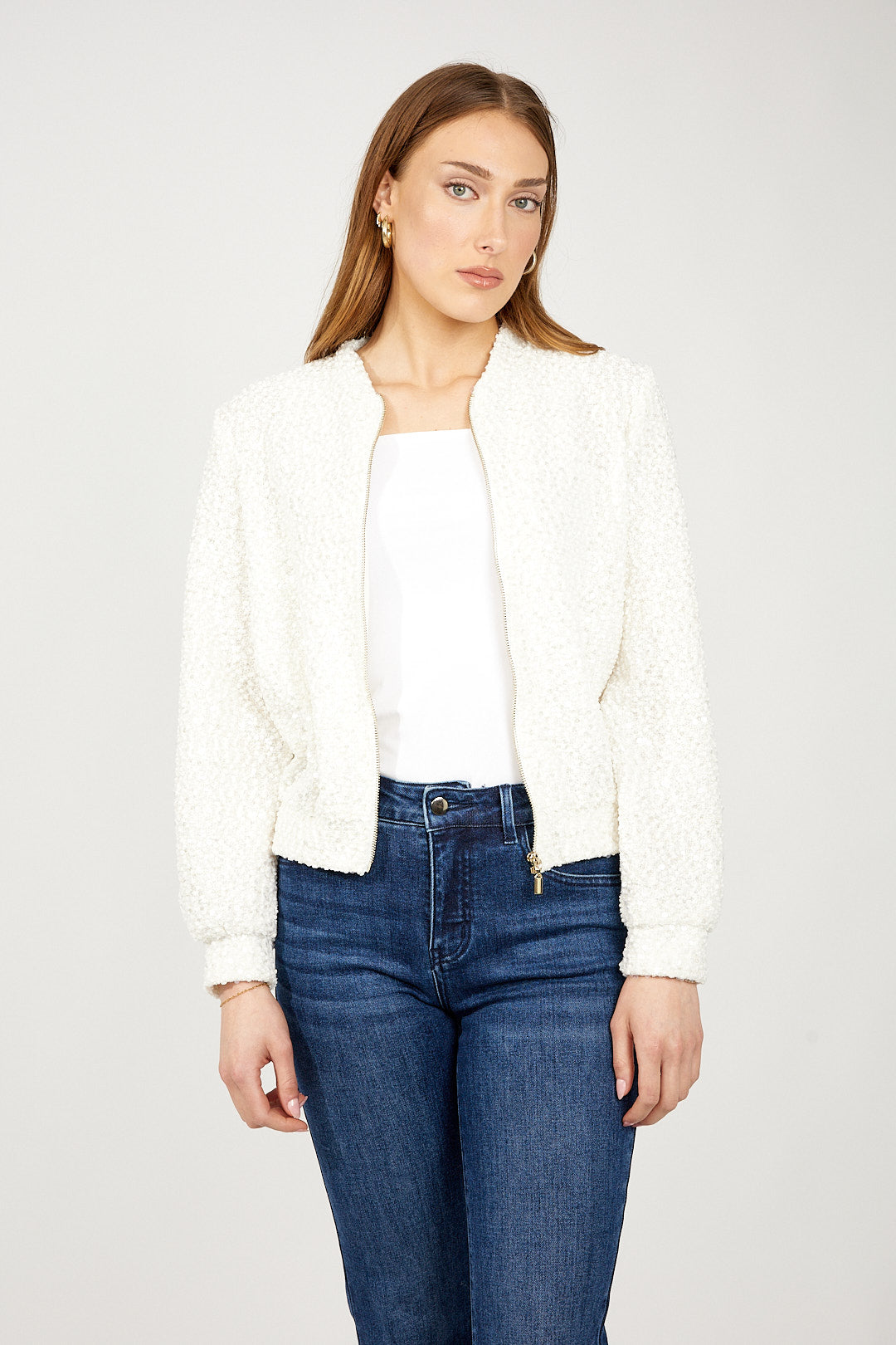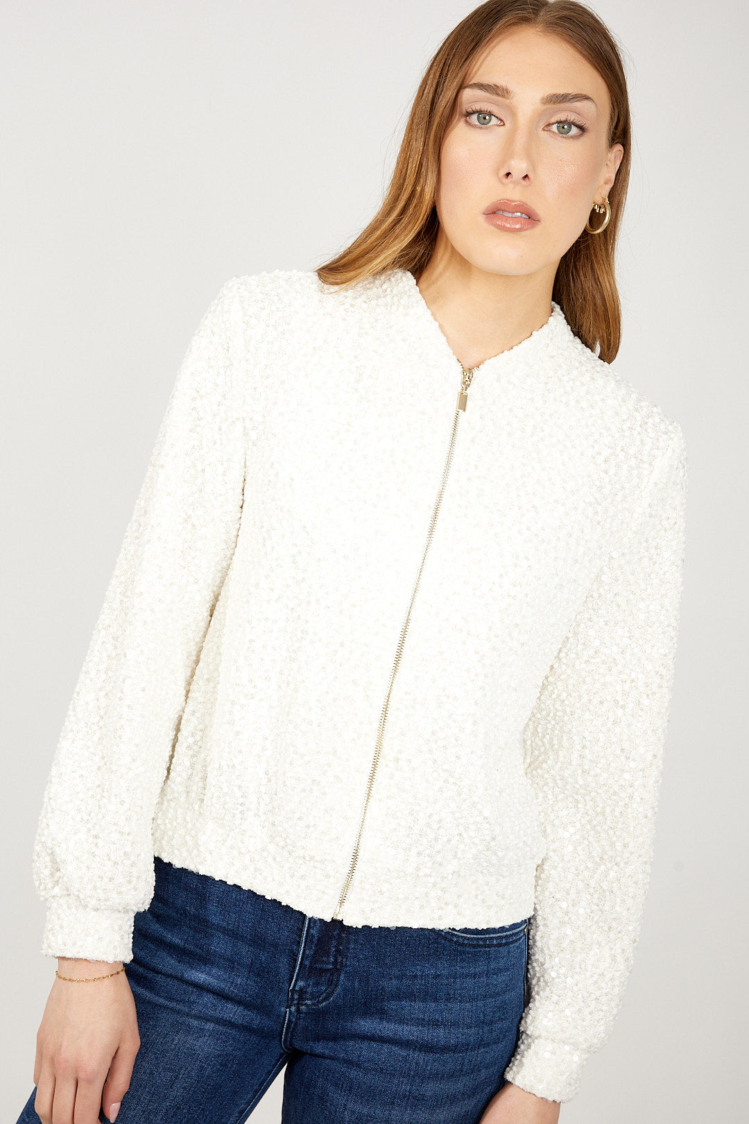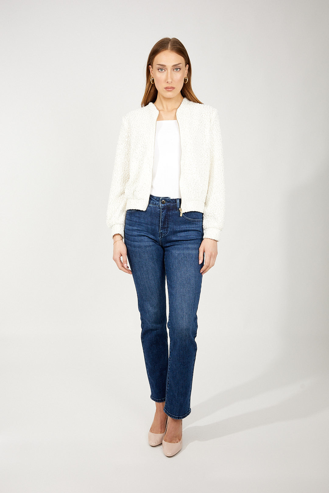 Introducing the Frank Lyman top, perfect for casual and semi-formal occasions. This regular-fit top features a convenient zipper closure, practical pockets, and a stylish collared neckline. Designed with a plain pattern and long, straight sleeves, it offers a waist-length cut that complements any wardrobe. Ideal for everyday wear, it effortlessly blends casual and feminine styles for a versatile addition to your collection.