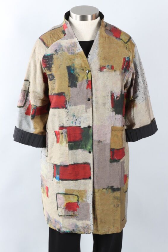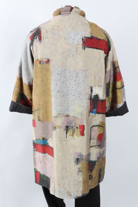 Made in viscose which is known for its silky lightweight texture and ability to drape beautifully. It falls above the knee with a snap close front, a deep v-neckline, full length raglan sleeves and all important front pockets. Best of all, it reverses from an autumnal inspired artful print on one side, to solid black with a crinkled texture on the other for twice the styling options. Please note, pattern and color placement will vary.