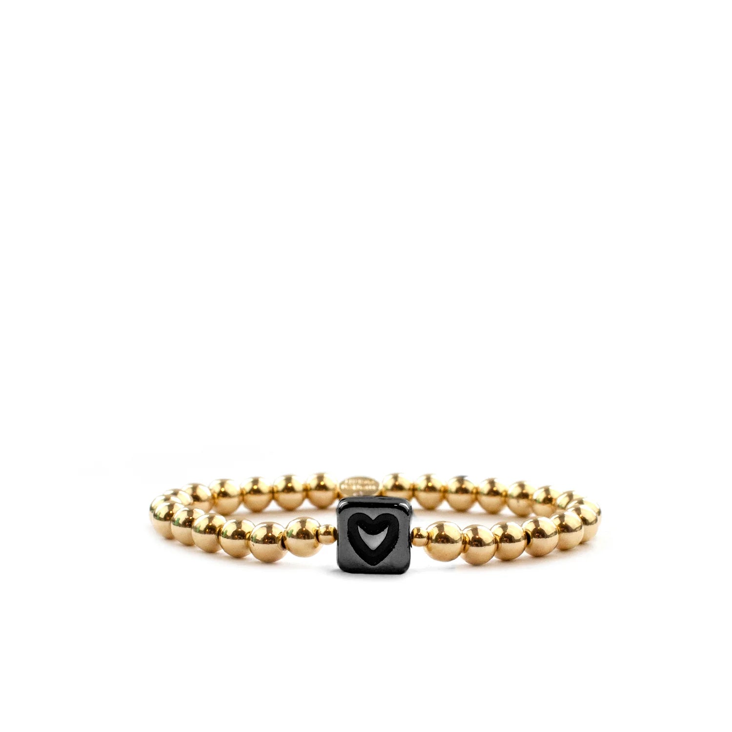 Metal beaded ball bracelet with double sided heart design. enamel open heart design on one side, pave stone open heart on other side. 6mm beads.
