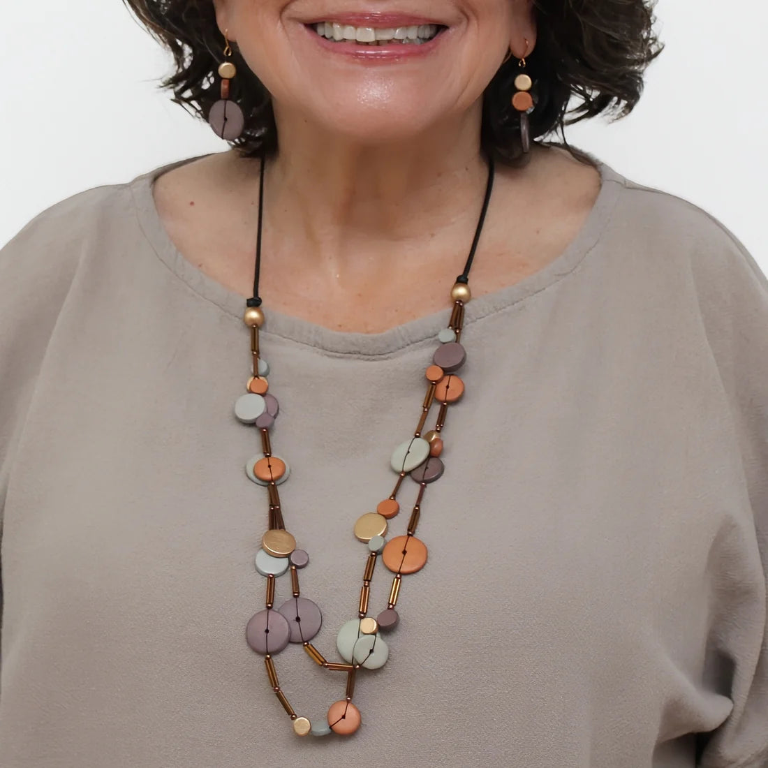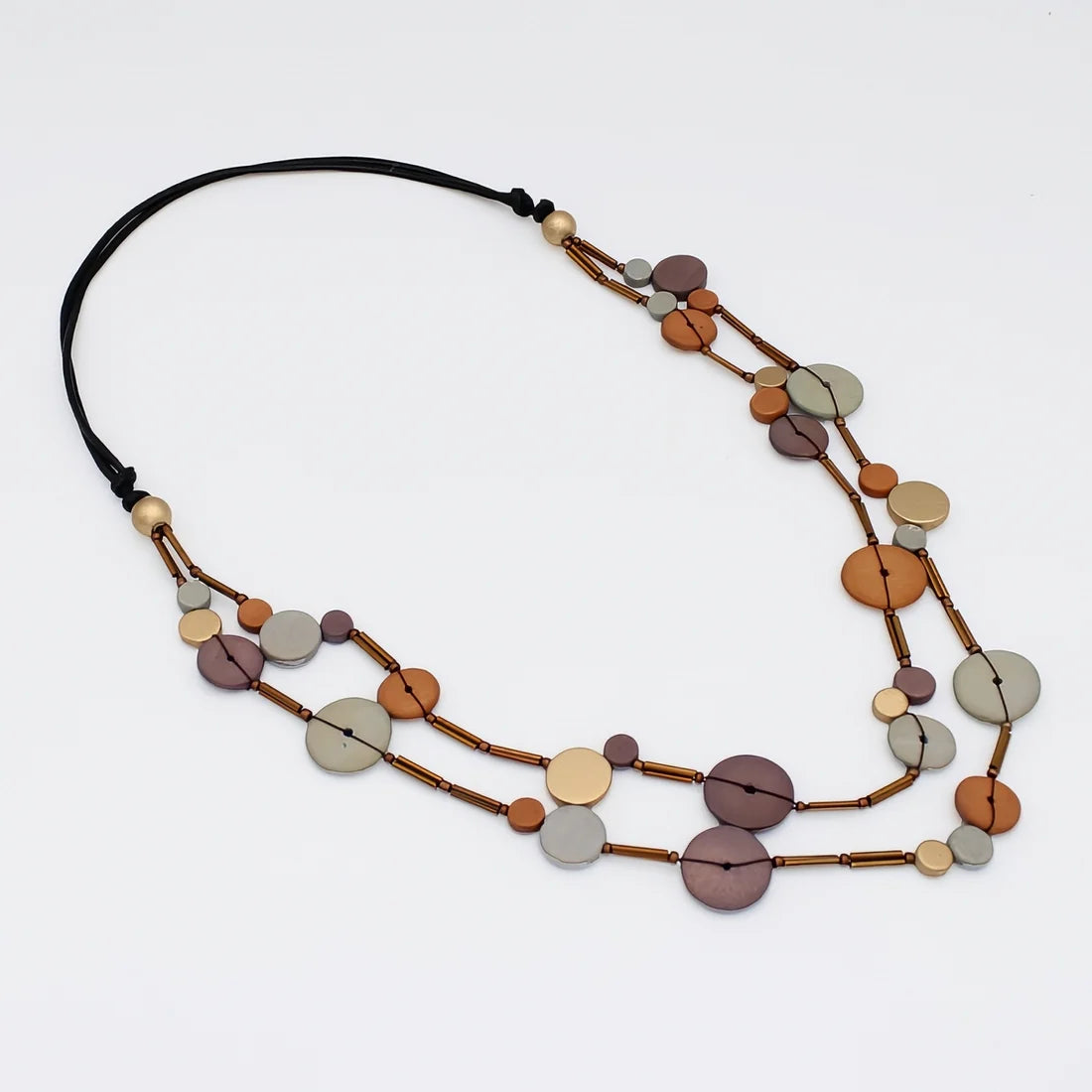 The Rust Cerelia Splendor Necklace combines rustic charm with elegant design. Featuring rust-toned round wood beads separated by gleaming bronze bugle beads, this lightweight statement piece is strung on an adjustable brown wax cord for a perfect fit. Its natural hues and subtle shine make it an ideal accessory to enhance any outfit with effortless style and comfort.
